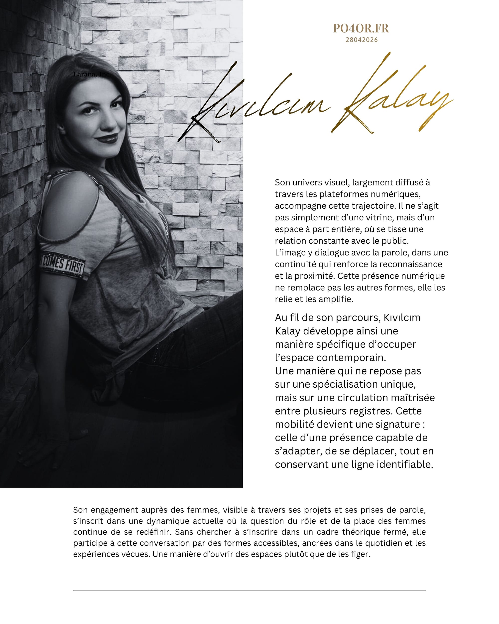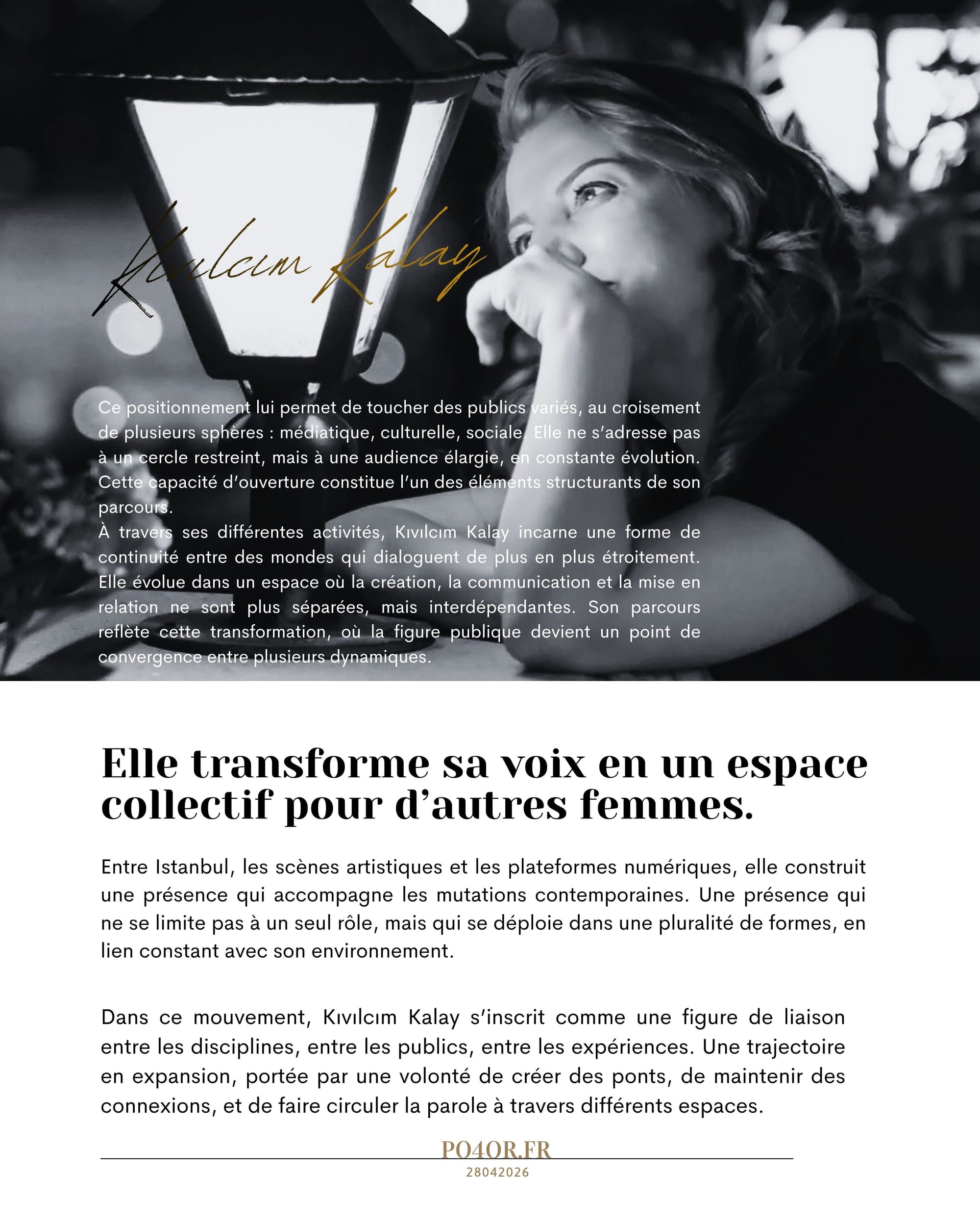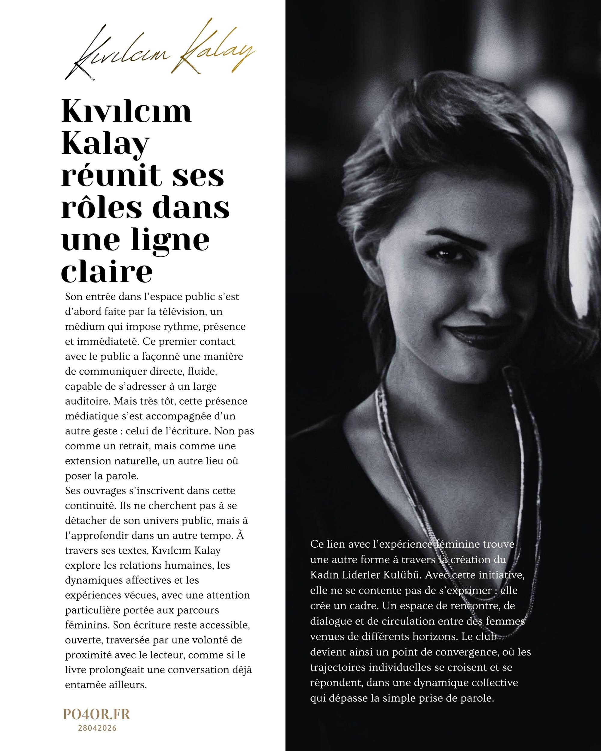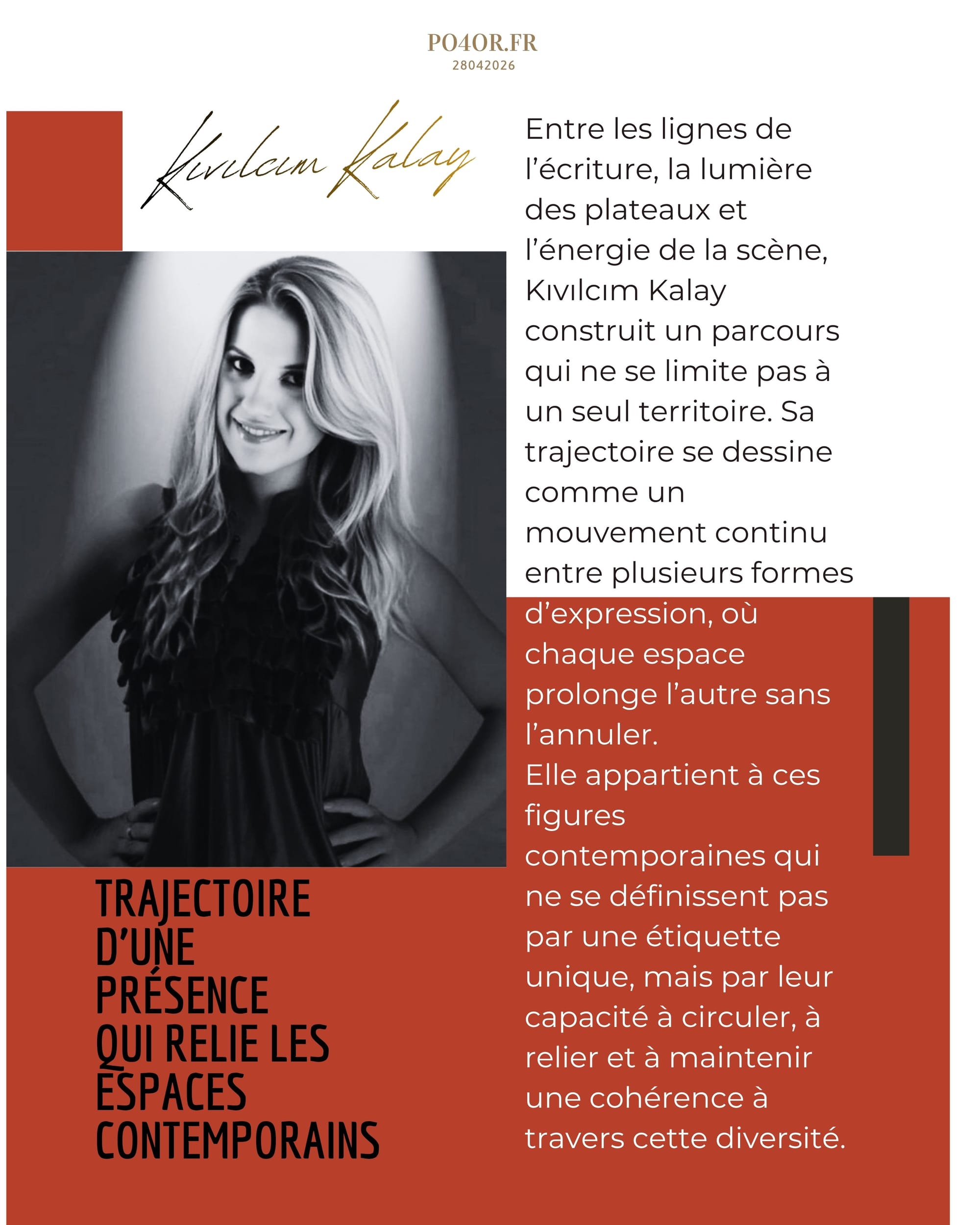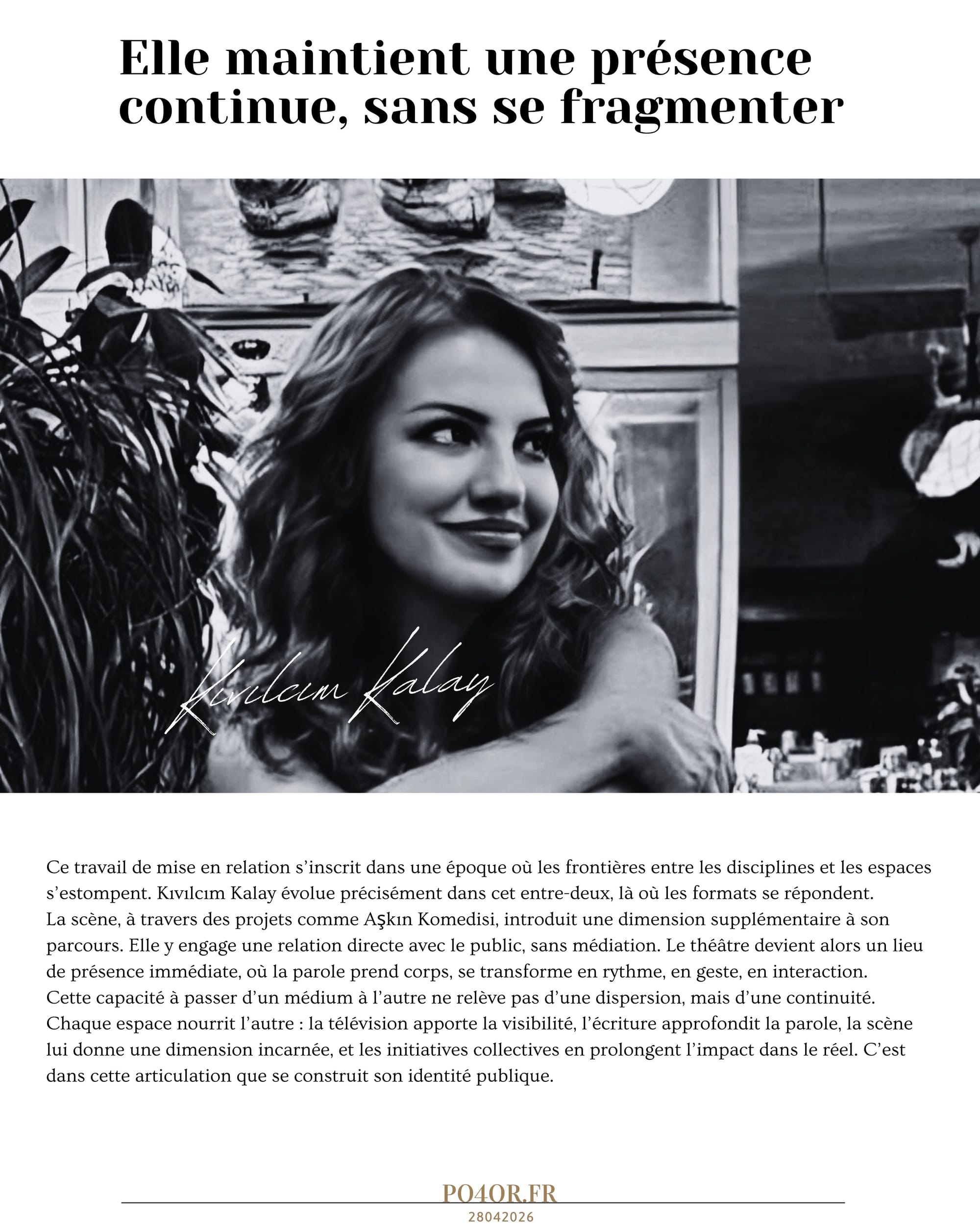 Entre les lignes de l’écriture, la lumière des plateaux et l’énergie de la scène, Kıvılcım Kalay construit un parcours qui ne se limite pas à un seul territoire. Sa trajectoire se dessine comme un mouvement continu entre plusieurs formes d’expression, où chaque espace prolonge l’autre sans l’annuler. Elle appartient à ces figures contemporaines qui ne se définissent pas par une étiquette unique, mais par leur capacité à circuler, à relier et à maintenir une cohérence à travers cette diversité.